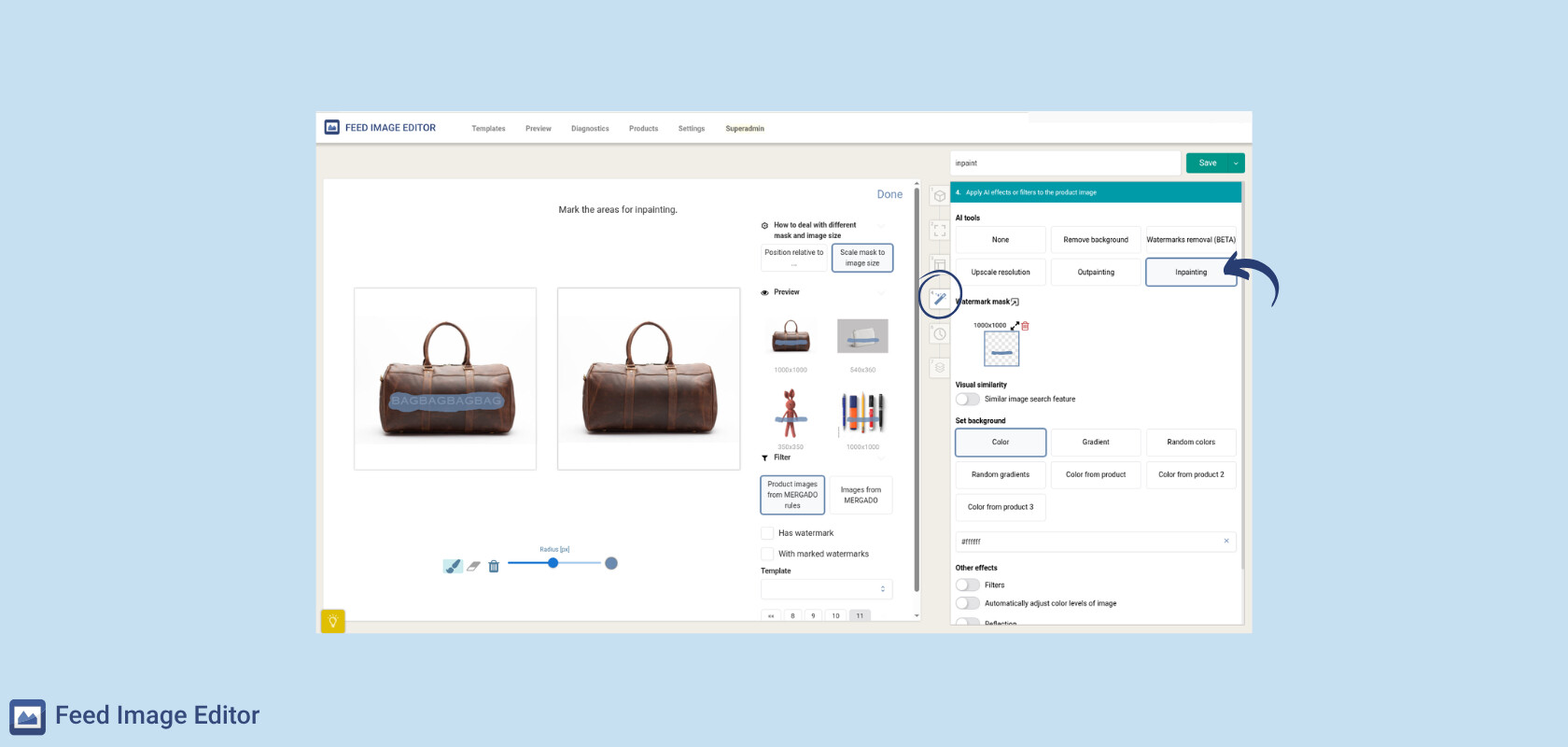 A new feature allows you to remove a recurring element (e.g., logo, tag, or watermark) from multiple product images in bulk — as long as it appears in a similar position. Compared to the watermark removal tool, this one is significantly faster. It instantly fills in the missing pixels after removal.