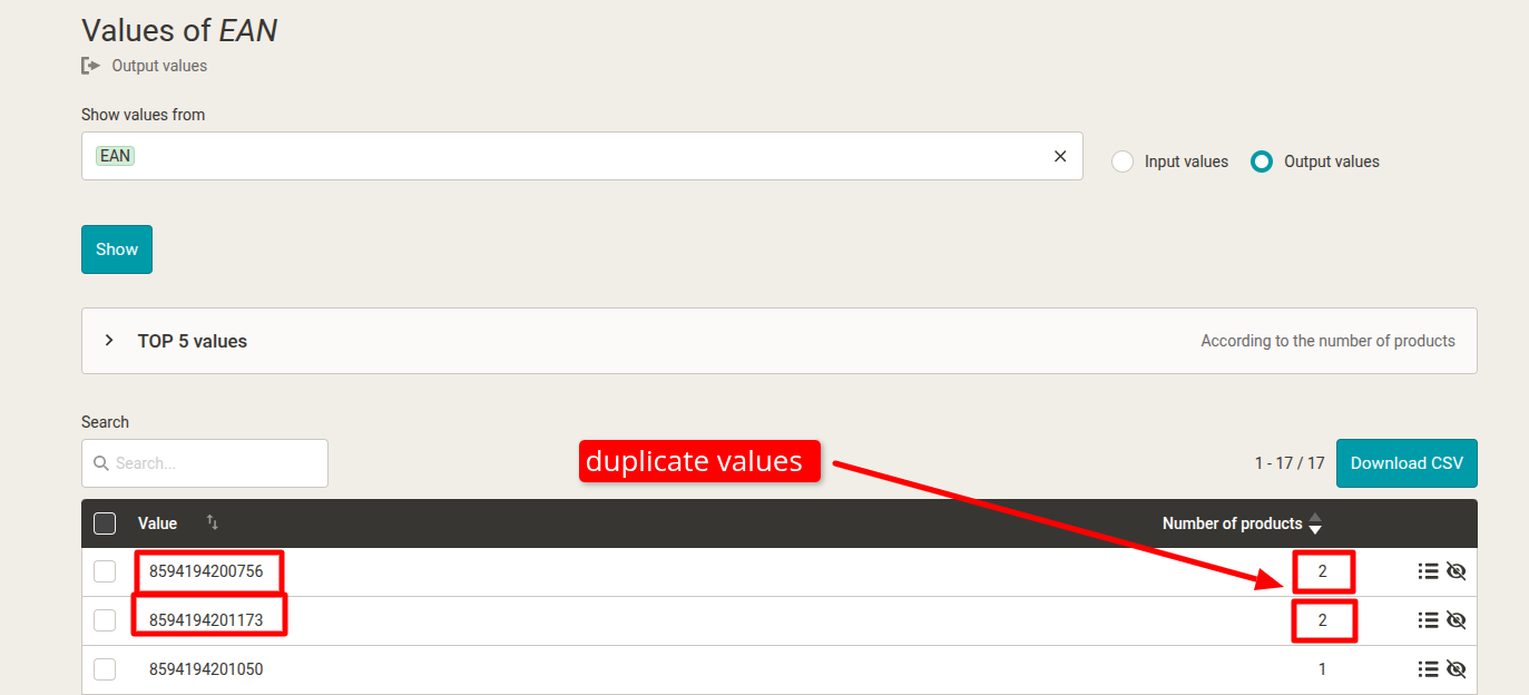 to list products with a given value, which leads to the Products page, where you can Download CSV with only these products. - Next, open the downloaded CSV file in Excel/Calc, etc., and copy the identifiers (e.g.,