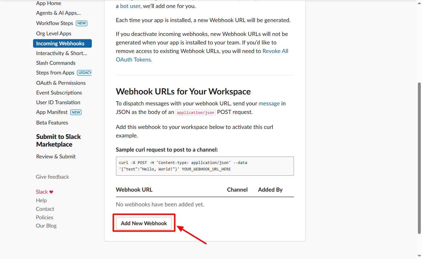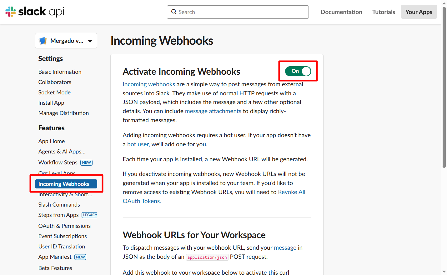 - Go to the Incoming Webhooks section in the left menu and enable (turn on) webhooks.