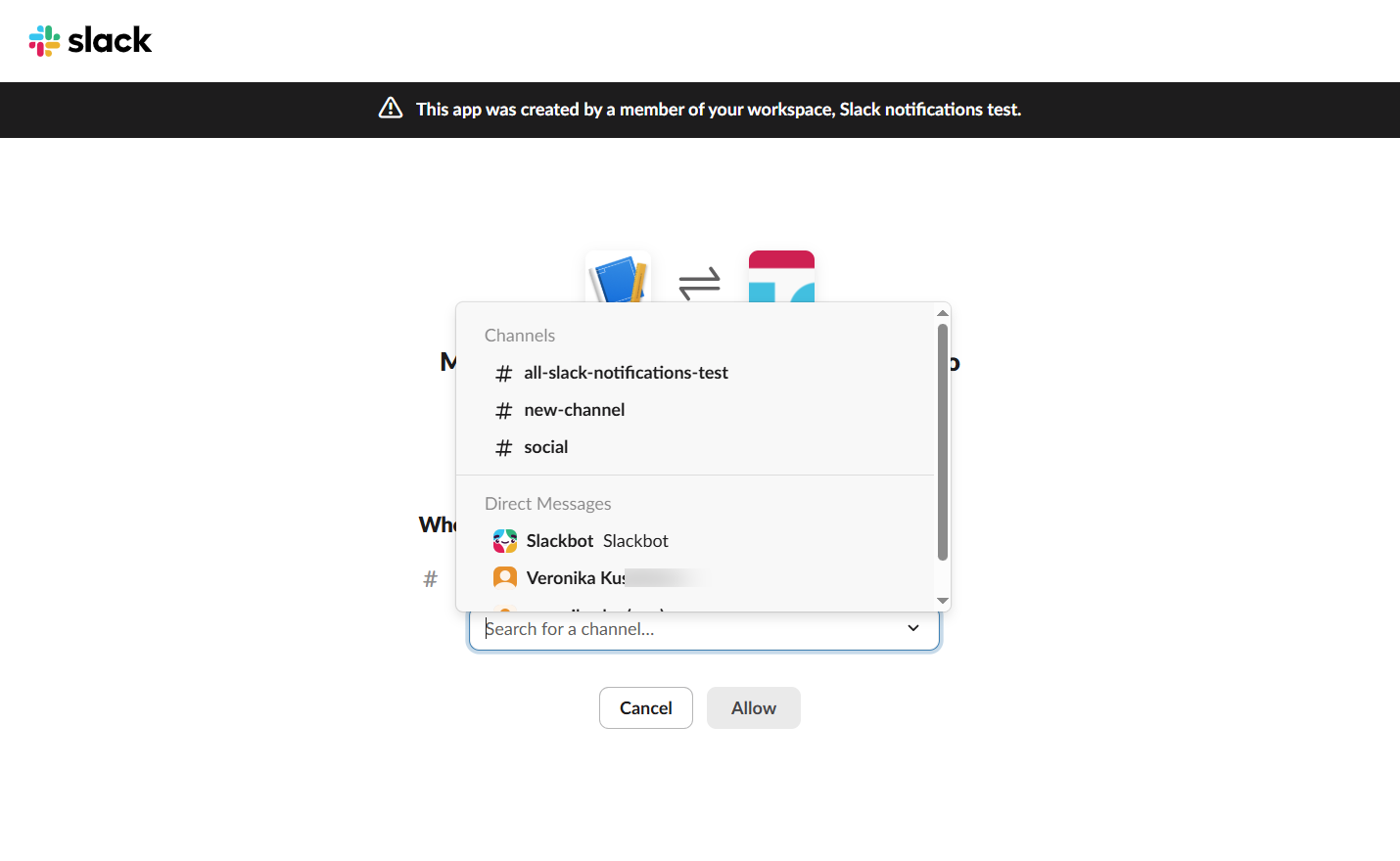 - Select the channel or user where you want Mergado notifications to be sent to Slack.