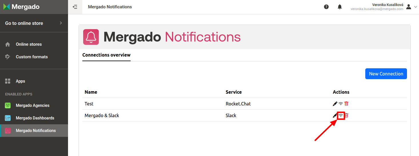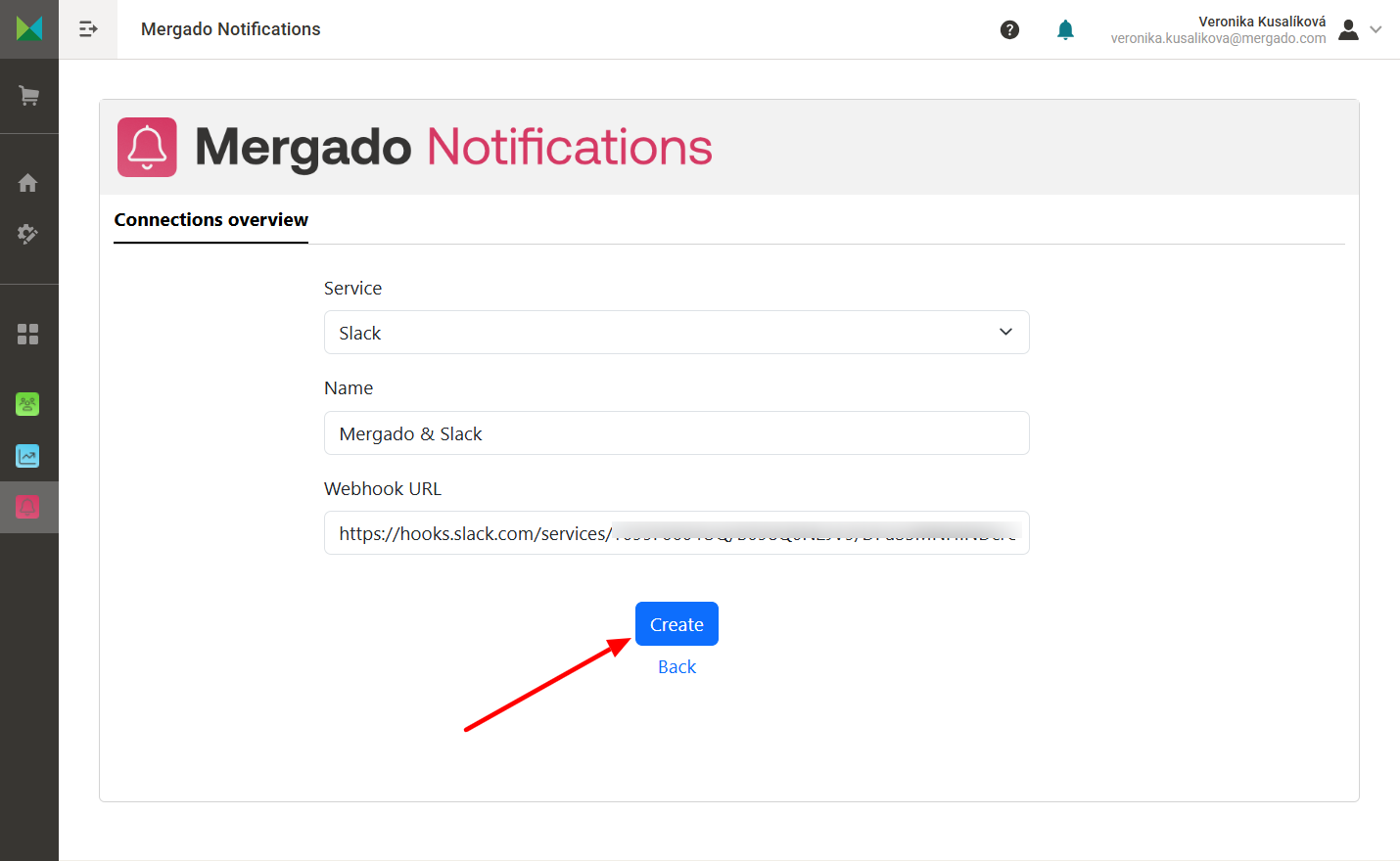 - Go to Mergado Notifications, create a new connection, and enter the copied webhook address.
