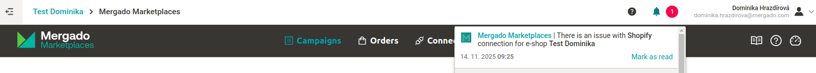 It is up to you how you want to be notified of any problems. If you choose Mergado Messages, notifications will be displayed in the upper right corner of Mergado: