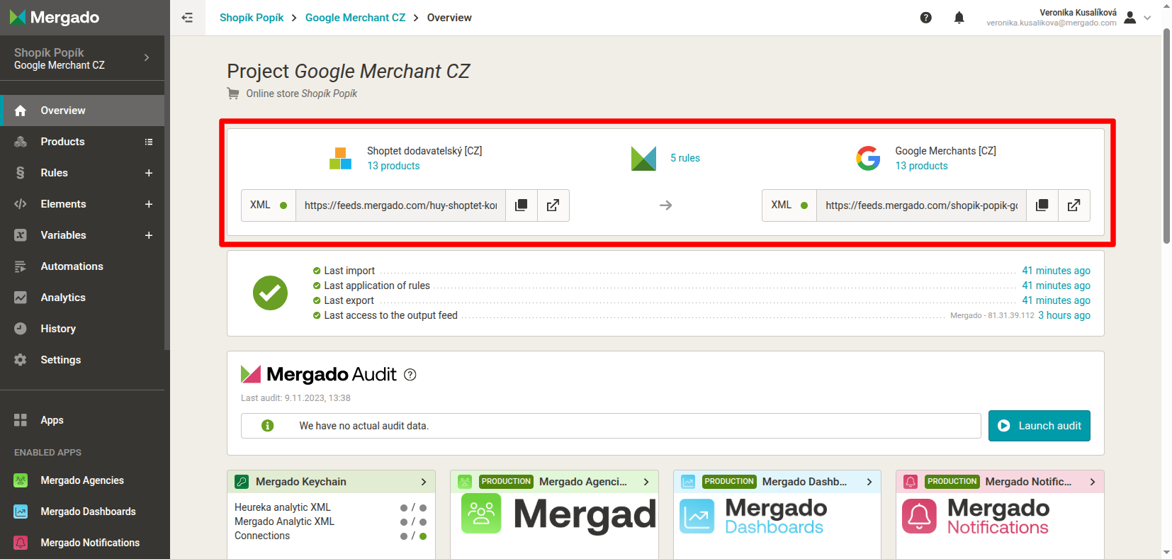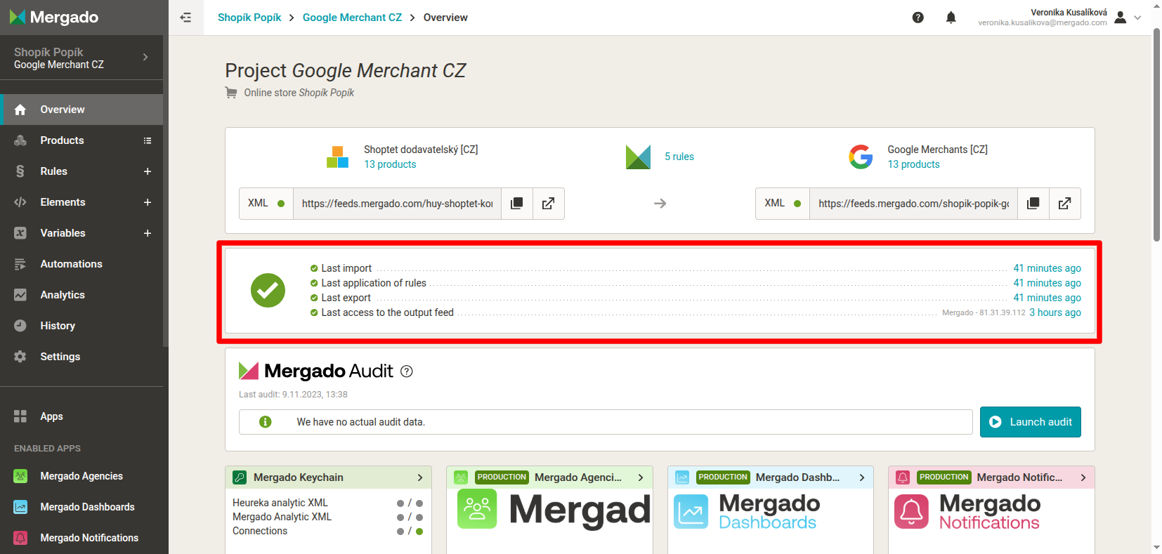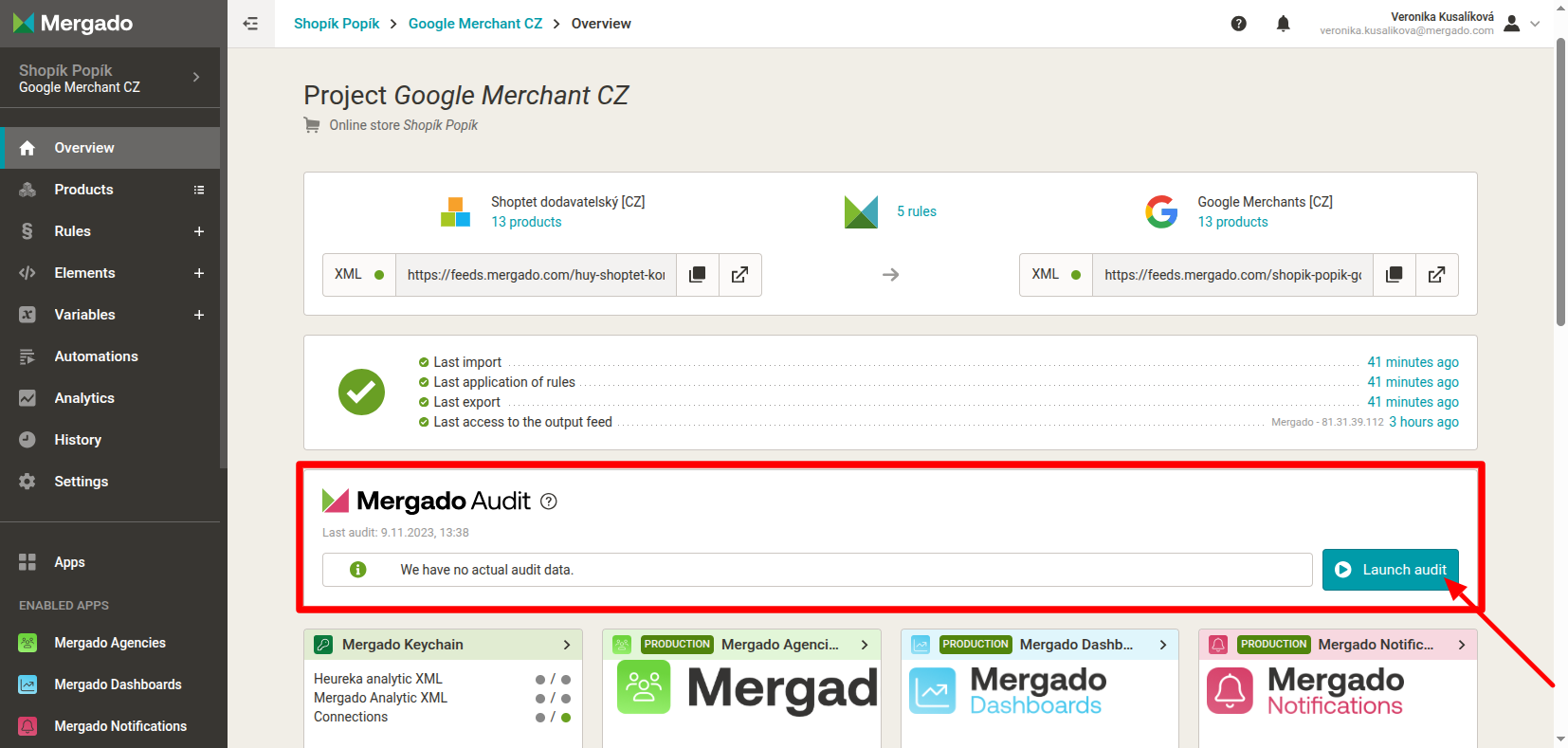 After creating a project, we recommend running Mergado Audit as soon as possible. This will allow you to find out what errors your feed contains. The results will be sent to your email.