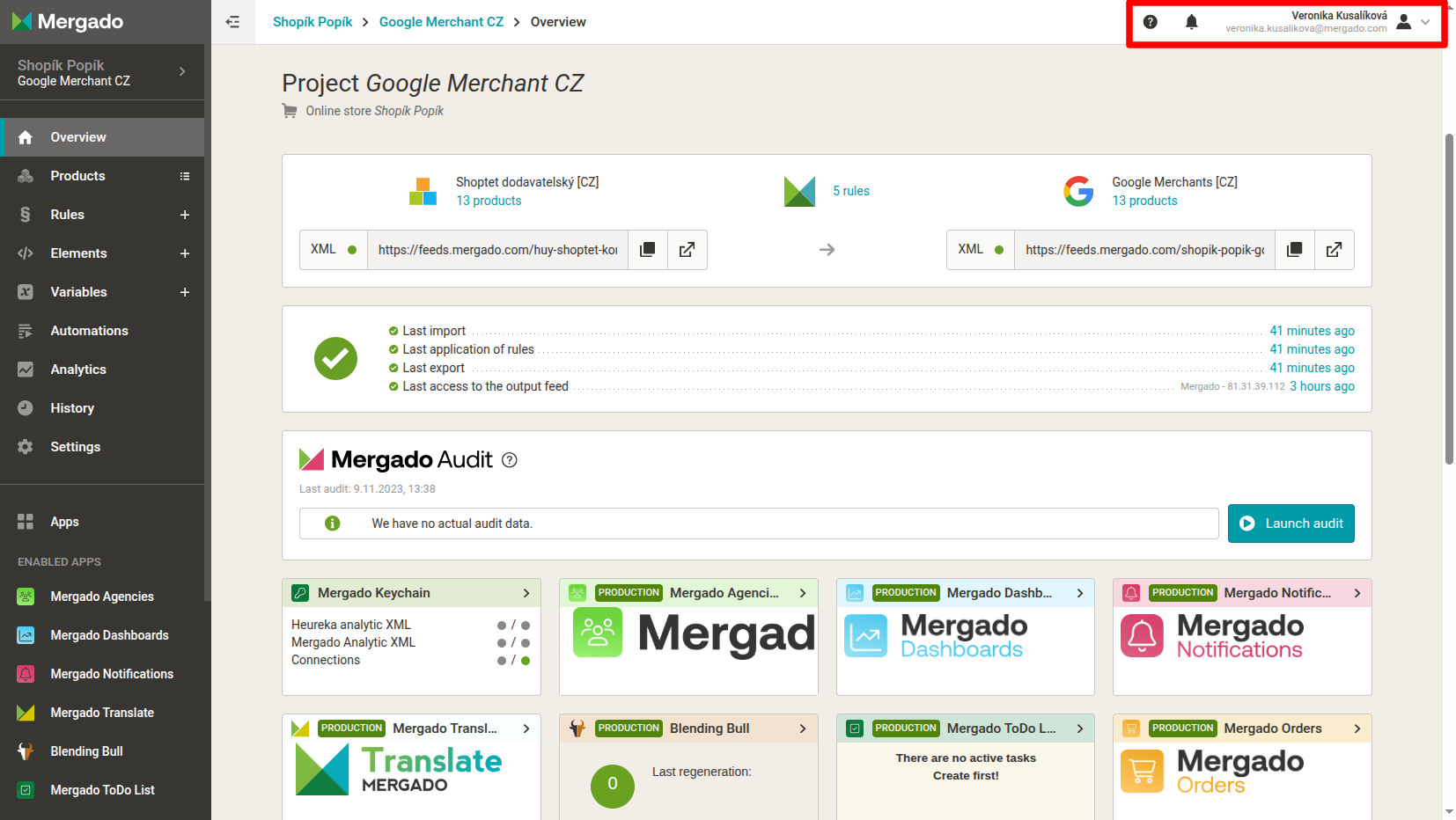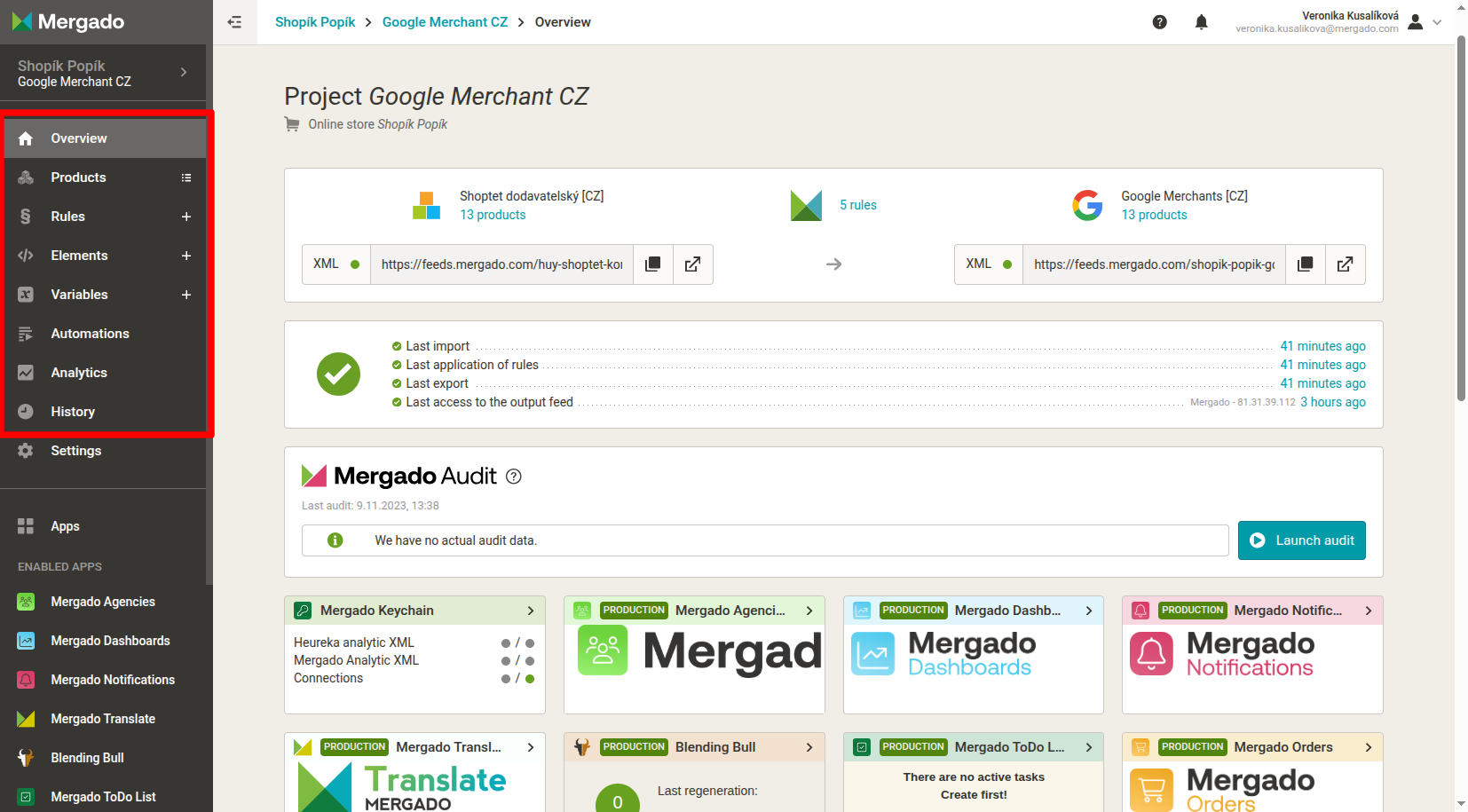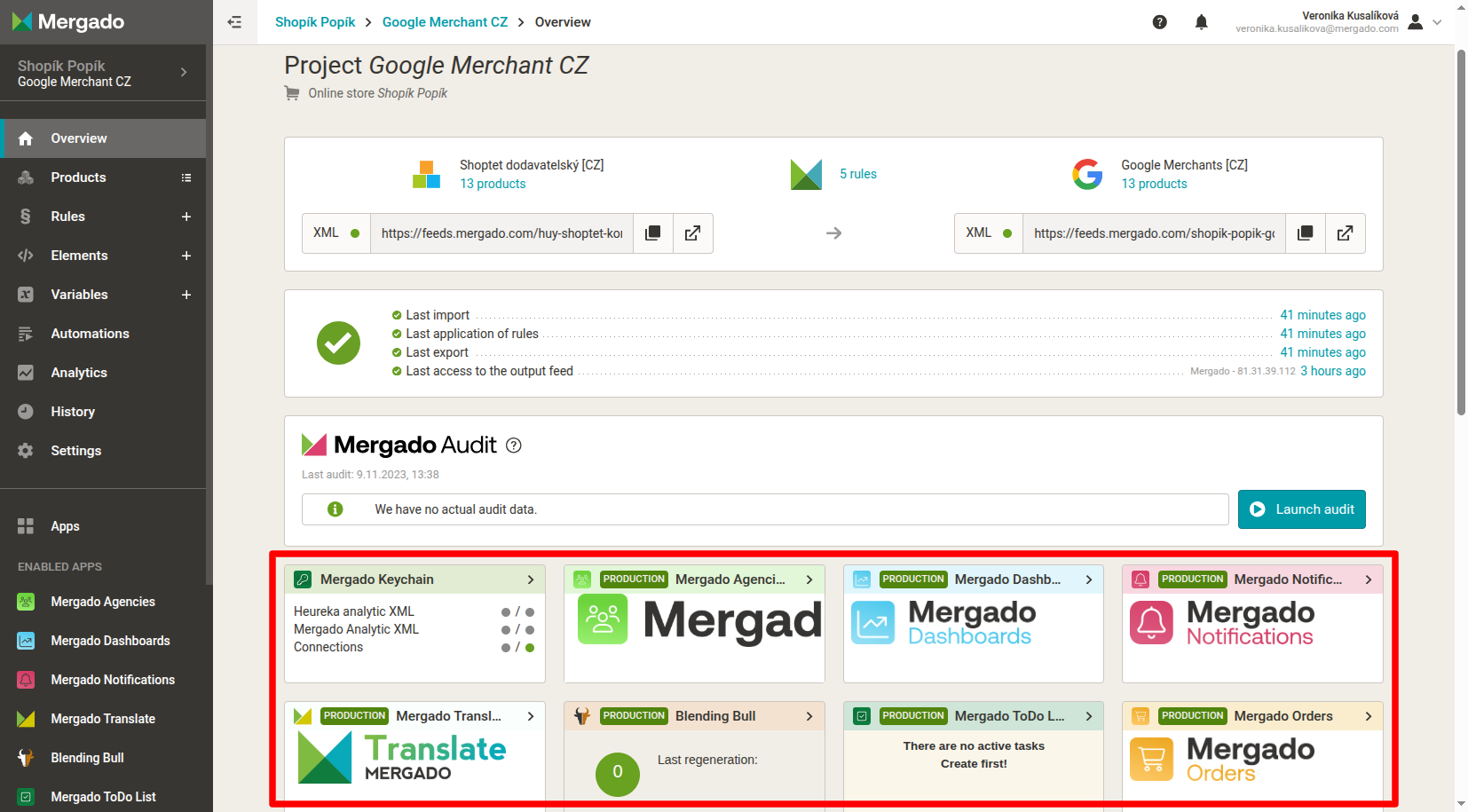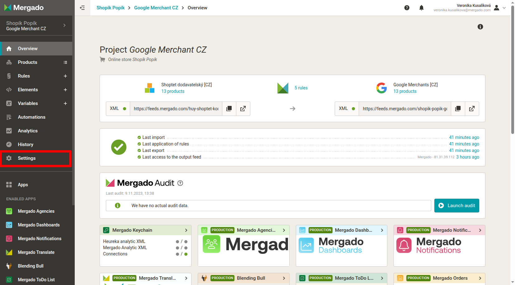After creating a project, we recommend running Mergado Audit as soon as possible. This will allow you to find out what errors your feed contains. The results will be sent to your email.