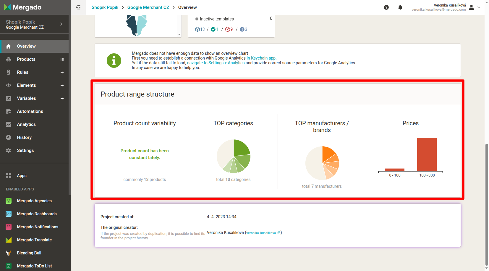 The product range structure provides you with basic information about the commercial effectiveness of your e-shop advertising. For it to work, you need to enter your Heureka or Google Analytics login details in Keychain.