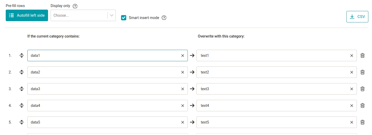Many e-shops use own category tags, but some search engines indicate a clear specification of the CATEGORYTEXT element content. This rule makes editing easier for you. For ease of work, this rule allows you to add multiple categories of pairs. Thanks to the added lines, everything can be saved as one rule, which saves a lot of work.